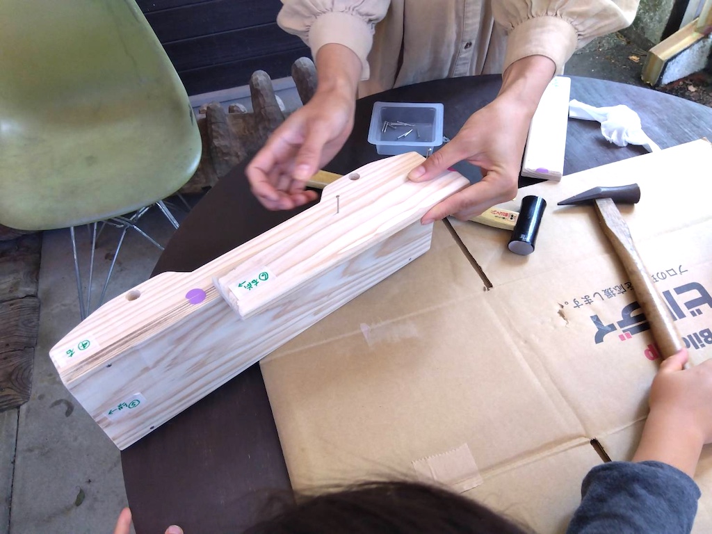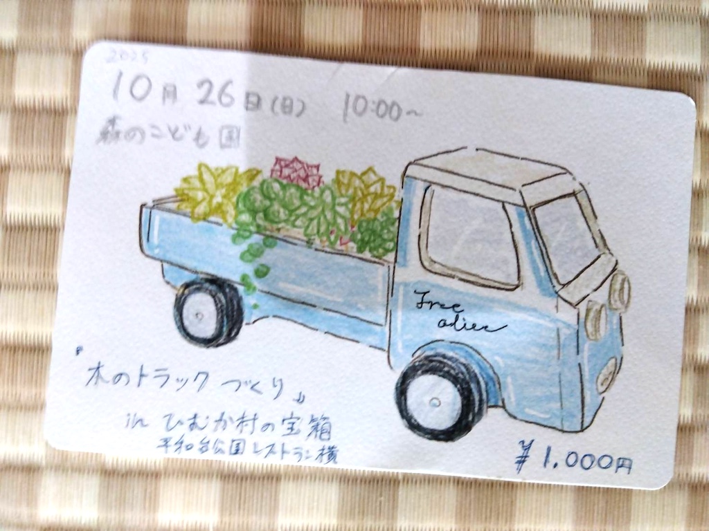 【イベント終了】森のこども園「木のトラックづくり」 投稿日 2025年10月29日 著者 trees.staff カテゴリー お知らせ 皆さまこんにちは。先日、宮崎市の平和台公園のレストラン横にあるひむか村の宝箱さまにて出張木育教室を開催しました。未就学児から小中学生のお子さんと親子で金づちと釘を使って組み立て、動く木のトラックを作りました。みなさん大人も子どもも夢中で作っていて、あっという間の2時間でした。 今回、ご参加いただいた皆さま方、場所を提供して下さったひむか村の宝箱 さま、木工サポートをしていただいた元ボーイスカウトの先生、本当にありがとうございました!